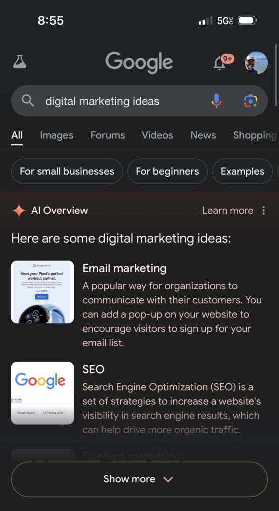 If I had embedded “digital marketing ideas” on my website, written blog articles sharing my ideas, and used all the other SEO tools at my disposal – I would lose out to Google’s AI in an instant.